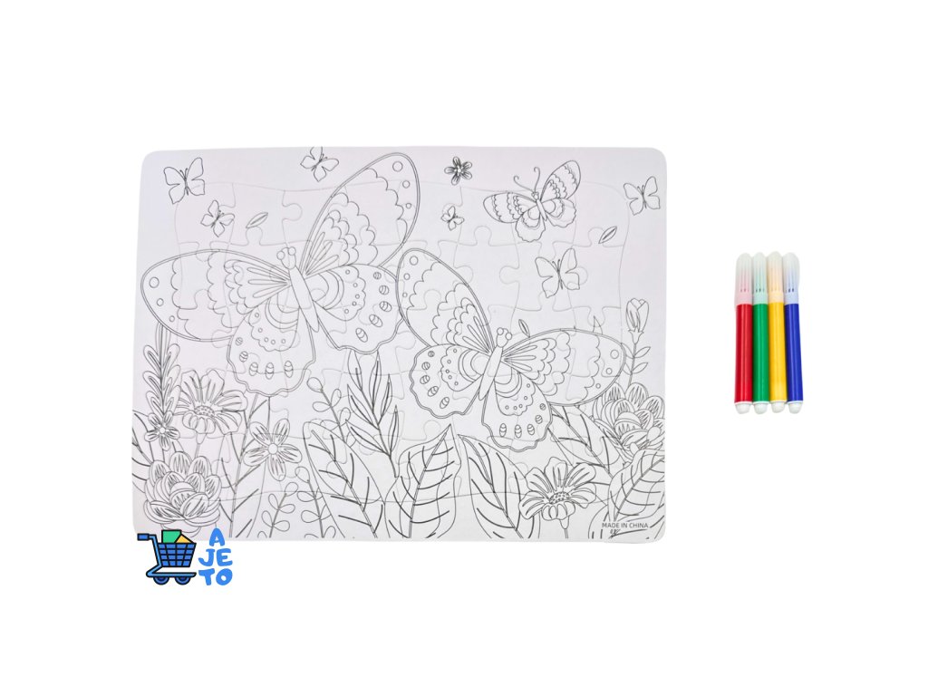 Balení obsahuje puzzle k vymalování a sadu čtyř barevných fixů