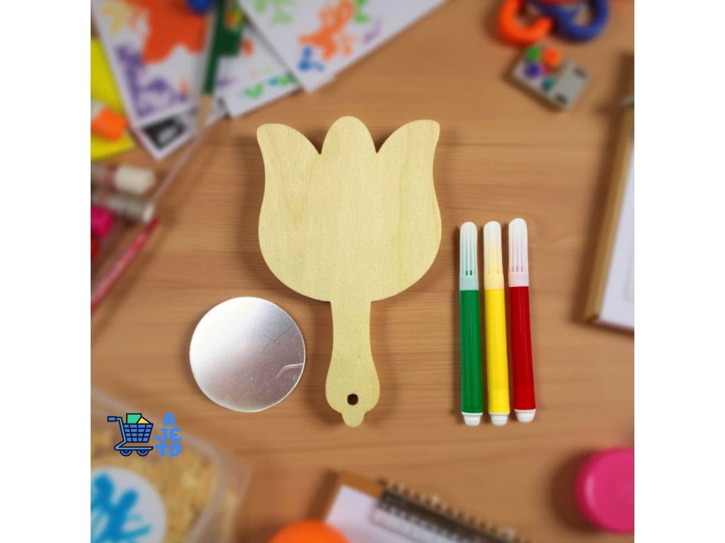 DIY sada na výrobu dřevěného zrcátka je ideální kreativní aktivitou pro děti. Sada obsahuje dřevěný výřez, malé zrcátko a tři barevné fixy. Děti si nejprve dřevěný tvar podle fantazie vymalují a poté pomocí samolepicí vrstvy snadno připevní zrcátko.