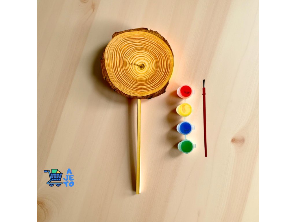 DIY sada na malování s jedním dřevěným lízátkem nabízí jednoduché a zábavné tvoření pro děti i dospělé. Dřevěná kulatina s výraznými letokruhy je vyrobena z přírodního dřeva, díky čemuž je každý kus originální.