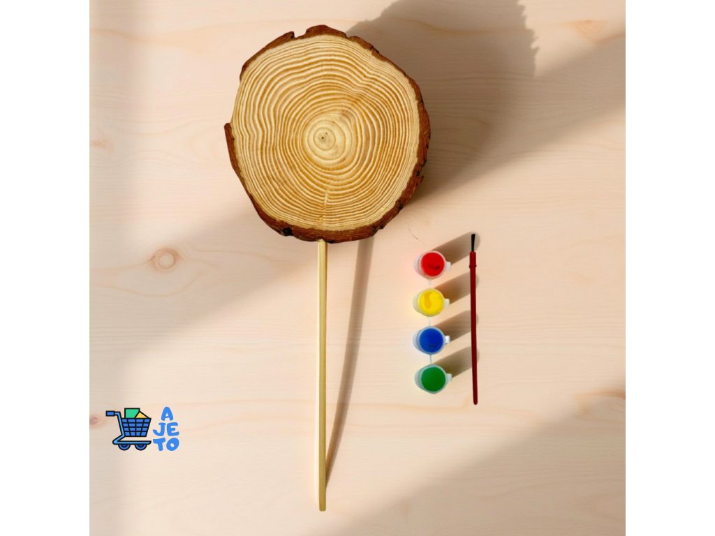 DIY sada na malování s jedním dřevěným lízátkem nabízí jednoduché a zábavné tvoření pro děti i dospělé. Dřevěná kulatina s výraznými letokruhy je vyrobena z přírodního dřeva, díky čemuž je každý kus originální.