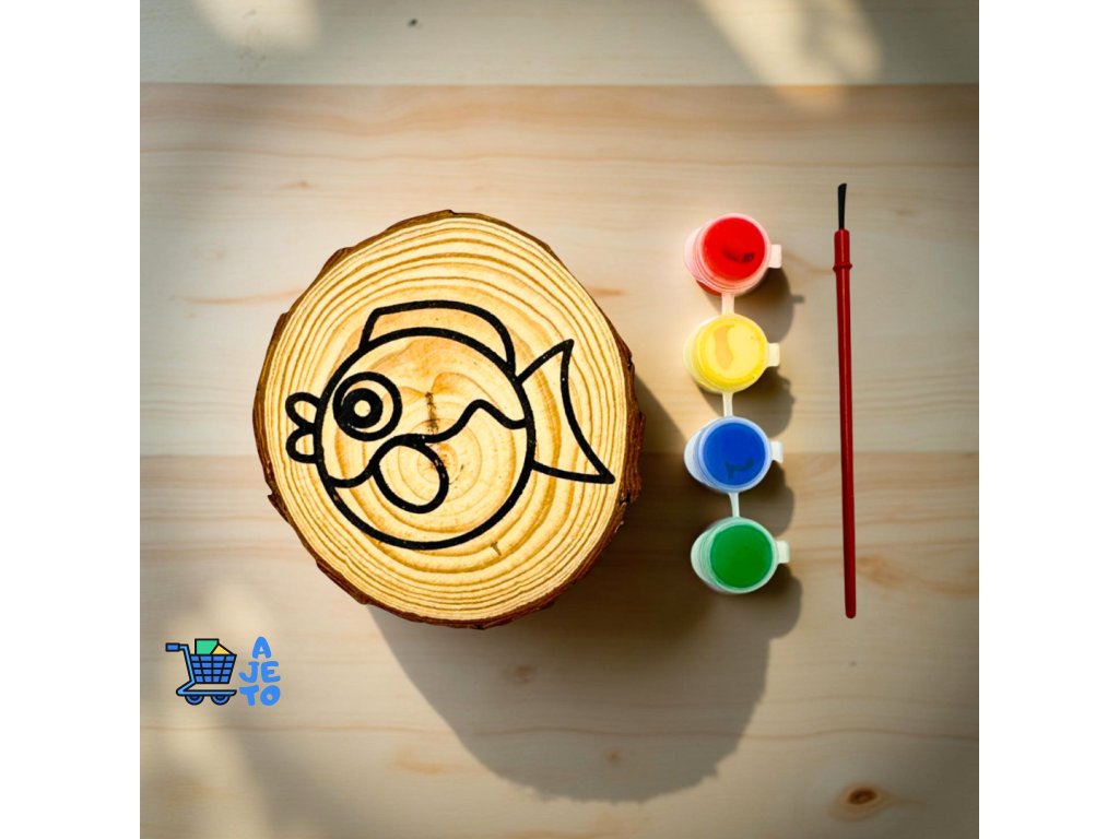 - Obsah balení: barvy, štětec a dřevěná kulatina s obrázkem.