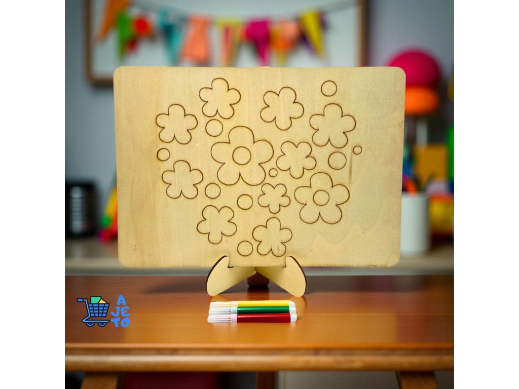 - Obsah balení: dřevěný obrázek, stojánek a 3 barevné fixy.