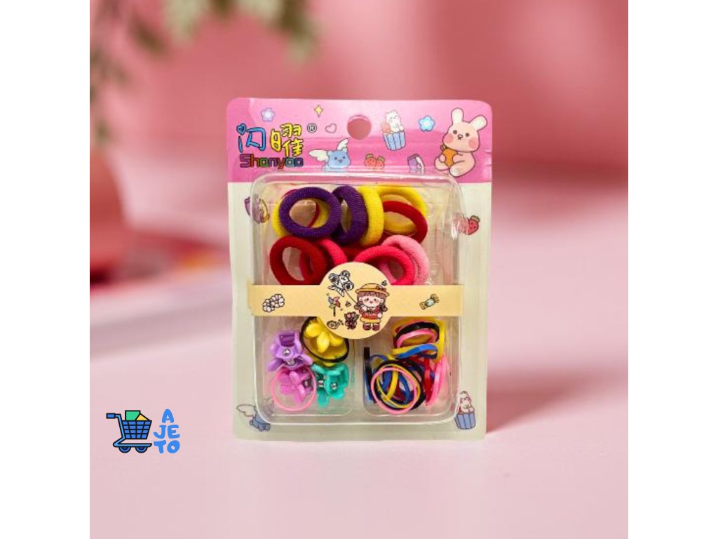 ✨ Veselá sada gumiček a mini skřipců pro hravé a rychlé účesy.