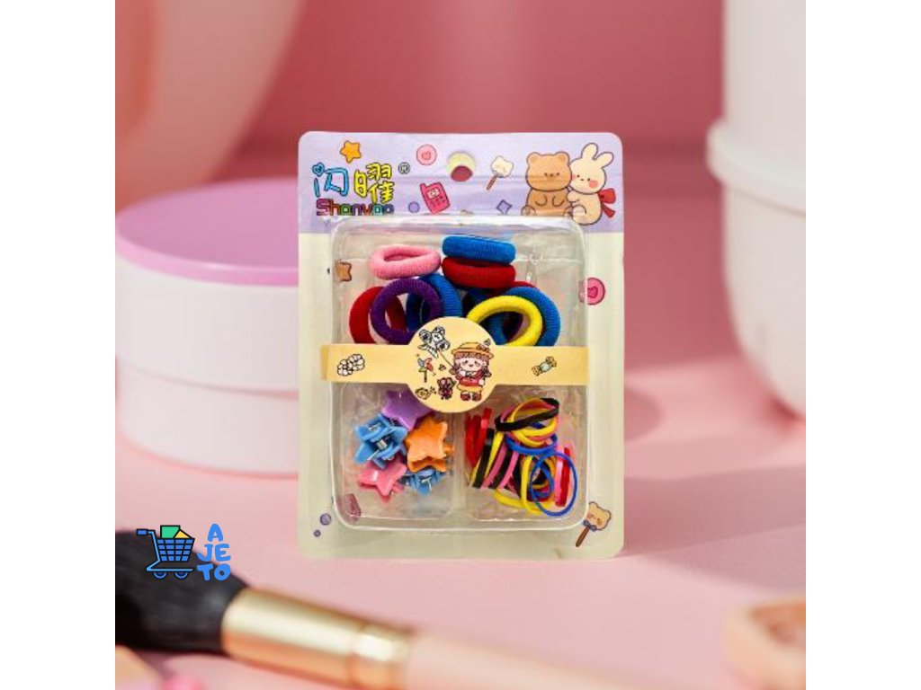 ✨ Veselá sada gumiček a mini skřipců pro hravé a rychlé účesy.