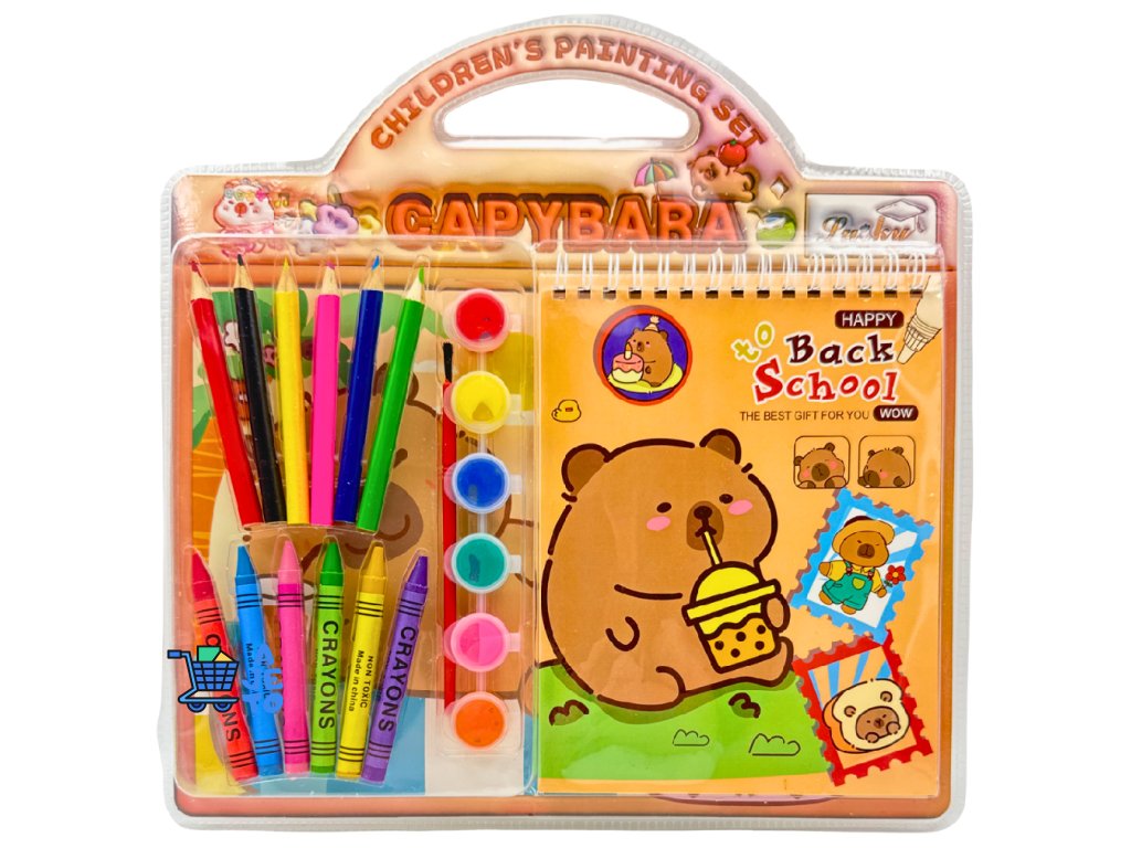 Sada obsahuje pastelky, voskovky, vodovky, štětec a bloček na malování