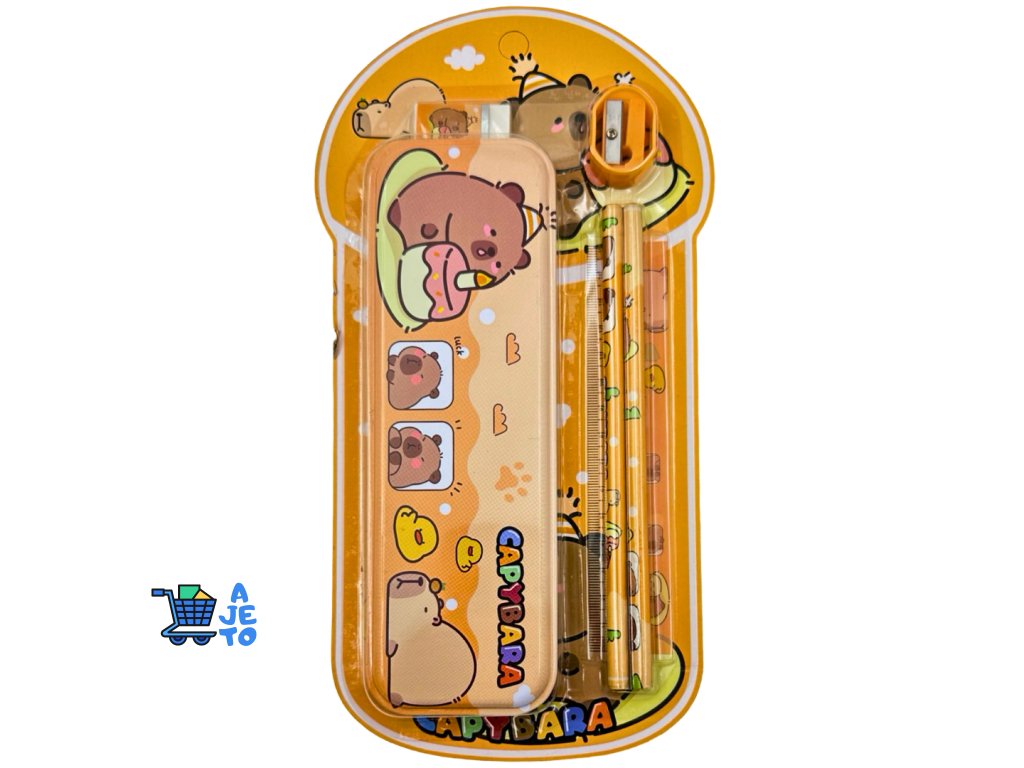 Sada obsahuje dvě tužky, pravítko, ořezávátko, gumu a penál